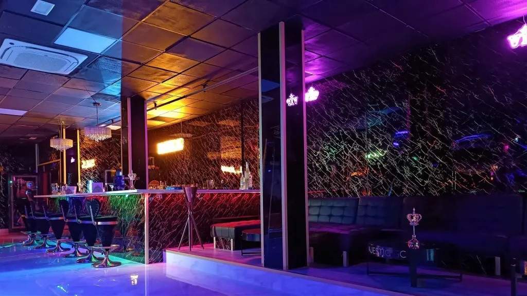 L’éclairage tamisé, la musique techno et les décors suggestifs créent une atmosphère immersive, entre bar lounge et playground assumé.
